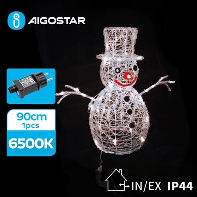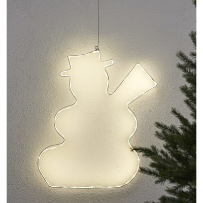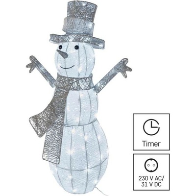 LED venkovní dekorace ve tvaru sněhuláka. Barva světla: teplá bílá. Časovač: 6 hod. zapnuto/18 hod. vypnuto. Napájení: 3x AA (nejsou součástí balení). Délka napájecího kabelu: 50 cm. Třída ochrany: IP44 (vnitřní i venkovní použití). Výška: 70 cm.