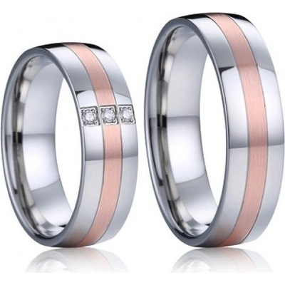 Luxusní ocelové snubní prsteny v hladkém provedení a kombinaci lesku s matem. U dámského prstenu jsou do růžově zlaceného pruhu ručně vsazeny tři diamanty. Rozměry: -...