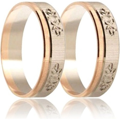 Snubní prsteny prsteny z bílého a červeného zlata ryzosti 585/1000-14karátů, zdobený rytinou květinkového motivu. Ceny prstenů jsou spočítány pro pár prstenů a to velikosti...