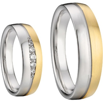 Elegantní ocelové snubní prsteny v moderním designu, které jsou v kombinaci vysokého lesku a sametového žlutého zlacení. Do dámského prstenu je vsazeno sedm ručně vsazených...