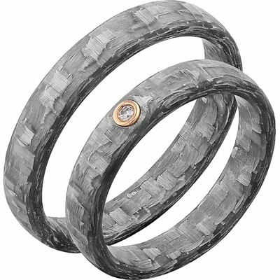 rafinované snubní prsteny z šedého karbonu s netradiční povrchovou úpravou. dámský kroužek zdobí drobný přírodní diamant ve zlatém lunetovém osazení. mírně zaoblený typ...