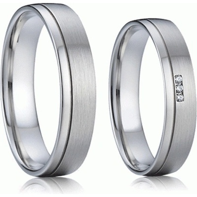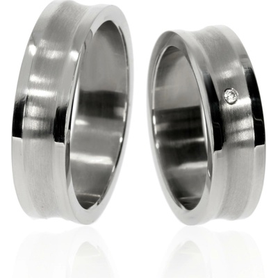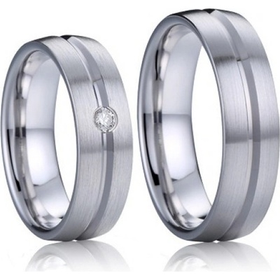 Elegantní ocelové snubní prsteny. Prsteny jsou v kombinaci lesku a saténového matu, který zde převládá. Dámský prsten zdobí tři zirkony. Rozměry: - Velikost: dámský 49-62...