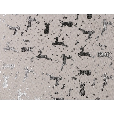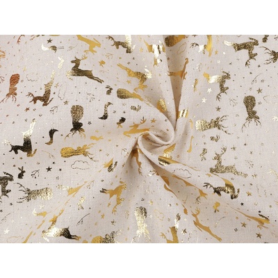 Hrubší bavlněná látka svou plátnovou vazbou připomíná len. Zdobí ji metalický potisk vánočních sobů. Využijete ji na šití ubrusů, dekoračních polštářů, tašek, pytlíků, ubrusů,...