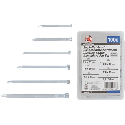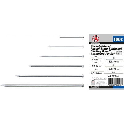 - v krabici se sortimentem - kalené Sada obsahuje: - 20 kolíků pro soklové lišty / podlahové lišty 1,4 x 25 mm - 20 kolíků pro soklové lišty / podlahové lišty 1,6 x 30 mm - 20...