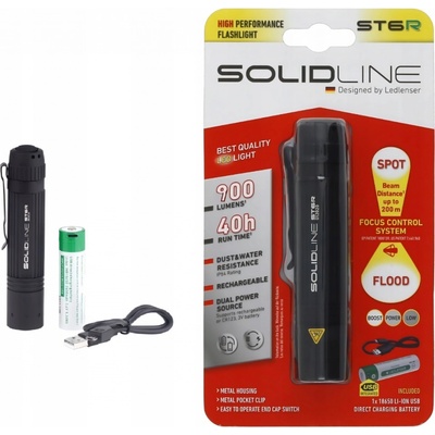 Solidline ST7R PARAMETRY Světelný tok 1000/250/-/30 lm Dosah světla 300/150/-/60 m Doba svícení-/5/-/40 h Baterie Li-Ion Dobíjení Ano Doba nabíjení: 300 min Hmotnost 160 g Délka 131 mm Certifikát odolnosti IP54 Test pádu z výšky 1 m