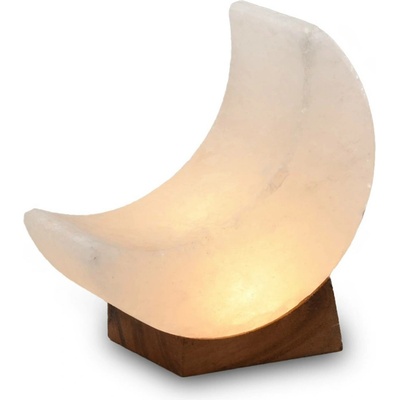 LED solná krystalová lampa Měsíc v bílé barvě s dřevěným podstavcem a USB kabelem Bílý solný krystal ve tvaru měsíce leží na dřevěném podstavci a je osvětlen LED diodou uvnitř....