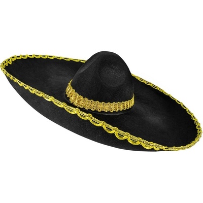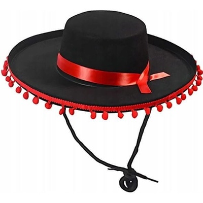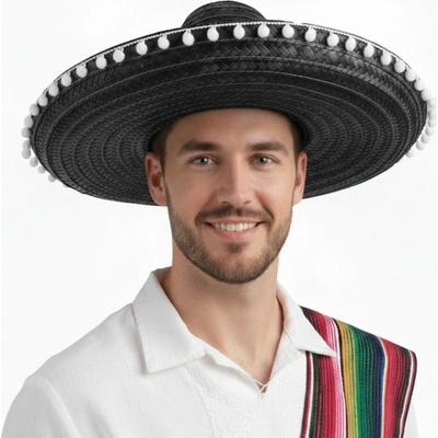 Černý mexický zdobený klobouk - sombrero o velikosti 50cm. Vhodné jako doplněk ke kostýmu Mexičan, na karneval. Černé sombréro s bílými bambulkami a se šňůrkou je slušivý...