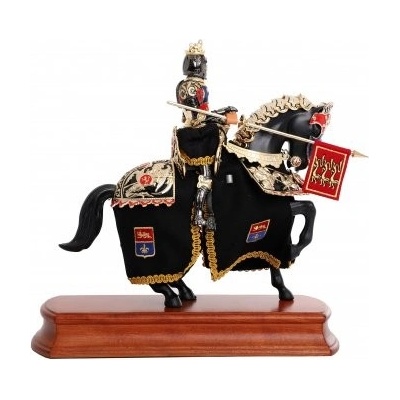 Soška rytíř Černý princ na koni od Art Gladius Černý, červený a zlatý smalt na zbroji koně a rytíře Rytíř s dřevcem, štítem a hrncovou přilbou se lvím klenotem Dodávka vč. korouhve, pláště a čabraky Kůň z polypropylenu na dřevěném podstavci Tkanina z černého...