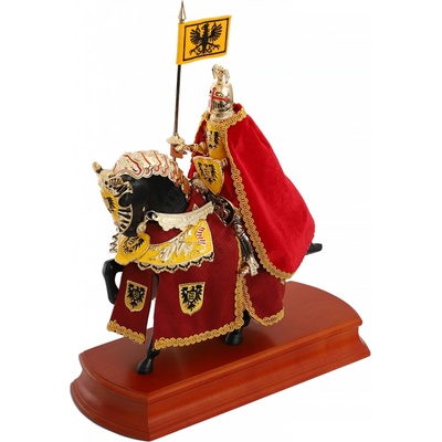 Rytíř na koni červený, soška Upozornění: Toto je pouze dekorativní předmět, nevhodný k reálnému použití! Barva a design vlajky se může lišit. Anglická kbelcová přilba Povrch postříbřený plátkovým stříbrem Kůň z plastu, kovové díly odlévané ze Zamaku - slitina zinku,...