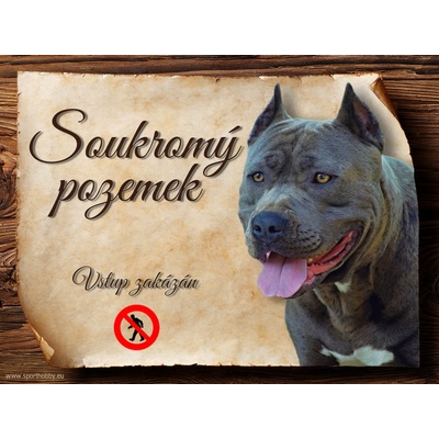 Originální kovová výstražná psí cedulka. Cedulka Americký stafordširský teriér I, hliníková s nápisem "Soukromý pozemek. Vstup zakázán." Kovová výstražná venkovní...