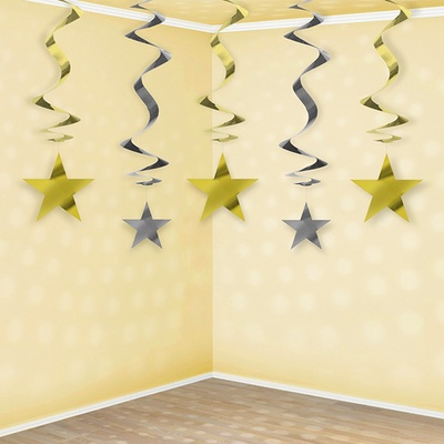 Závěsné spirály se zlatými a stříbrnými hvězdičkami. V balení 5 kusů. Délka 60 cm Pojmy spojené s tímto produktem: závěs, spirála, dekorace, hvězdy, hvězdičky, zlatá, stříbrná, Silvestr