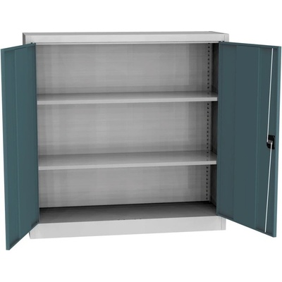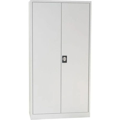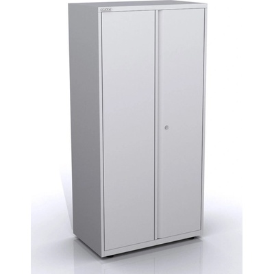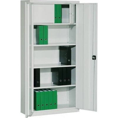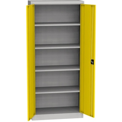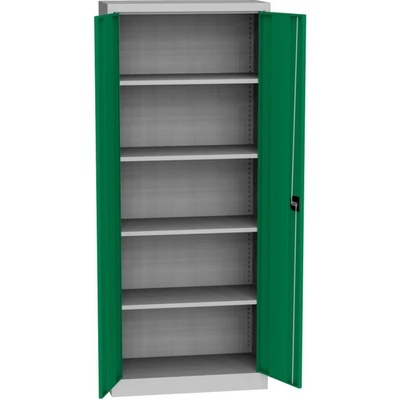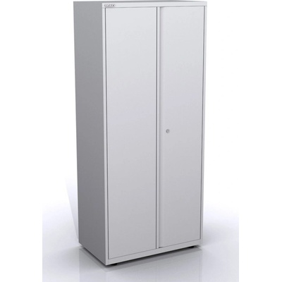 Dvoudveřová kovová skříň se čtyřmi policemi, šířky 800 mm (viz varianty produktu), výška 1990, hloubka 435 mm. Dvoubodový rozvorový zámek, různé barvy.