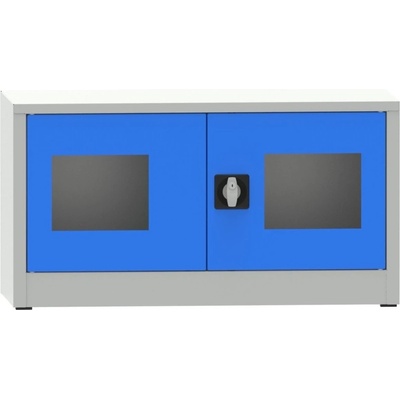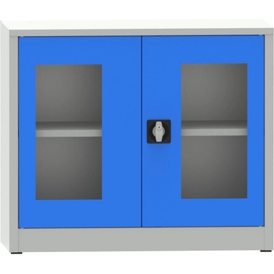 Dvoudveřová kovová svařovaná skříň s prosklenými dveřmi plexisklem, šířka 950, výška 800, hloubka 500 mm, 1x přestavitelná police. Barva korpusu RAL 7035 světle šedá, dveří RAL...