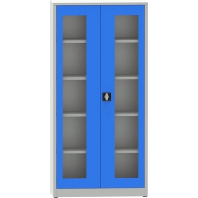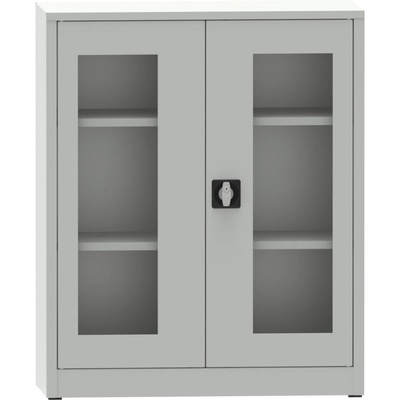 Dvoudveřová skříň se soklem, šířka 1200, výška 1150, hloubka 400 mm, 2 police. Dveře se skleněnou výplní. Barva korpusu RAL 7035 světle šedá.