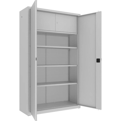Dvoudveřová kovová skříň se třemi policemi a vnitřní dělenou uzamykatelnou schránkou, šířky 1200 mm (viz varianty produktu), výška 1990, hloubka 435 mm. Dvoubodový rozvorový...