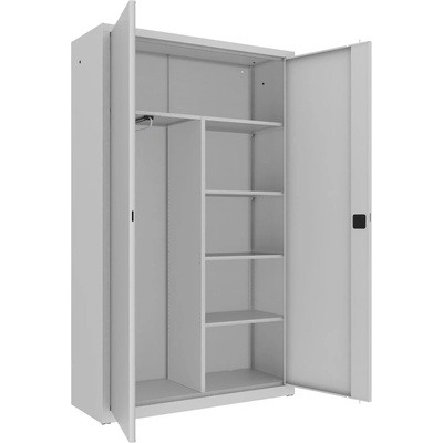 Dvoudveřová kovová skříň se čtyřmi policemi a šatním oddílem s výsuvnou tyčí pro zavěšení ramínek, šířka 1200 mm (viz varianty produktu), výška 1990, hloubka 435 mm. Dvoubodový...