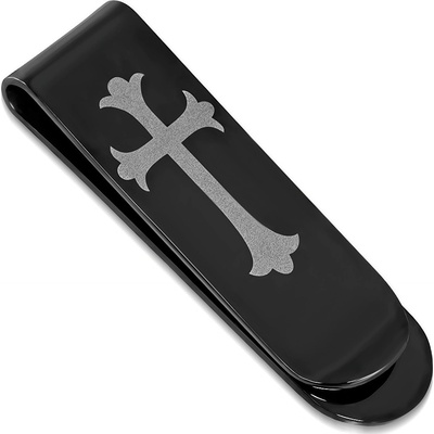 Elegantní spona na bankovky černé barvy s lesklou povrchovou úpravou a vyobrazením kříže. Spona je vyrobena z chirurgické oceli vysoké kvality, která udržuje svůj lesk a odolává...