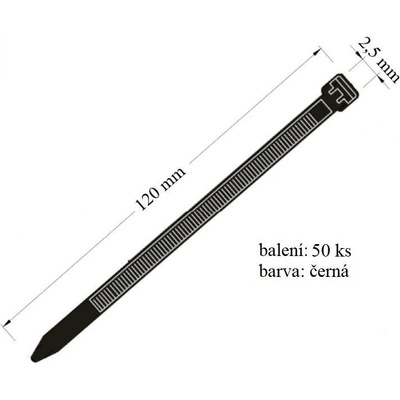 Stahovací páska černá, 50ks, 2,5x120 mm (EAN: 8585023341139) Stahovací páska o rozměrech 2,5x120 mm v černé barvě je nepostradatelným spojovacím prostředkem pro mechanické...