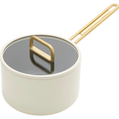 Omáčník (rendlík) ve světle krémové barvě kararského mramoru s dlouhou rukojetí a skleněnou poklicí má průměr 20 cm a objem 3,8 l. Je z kolekce Stanley Tucci značky GreenPan....