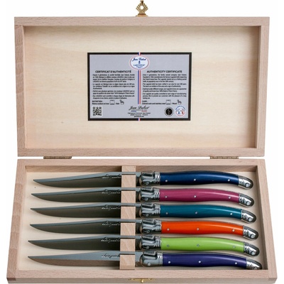 Steakové nože, 6ti dílná sada Laguiole Jean Dubost Materiál rukojeti je z plastu (ABS) Čepel je z nerezová oceli 18/10 o tloušťce 2.5 mm Dodáváno v dárkové dřevěné...