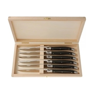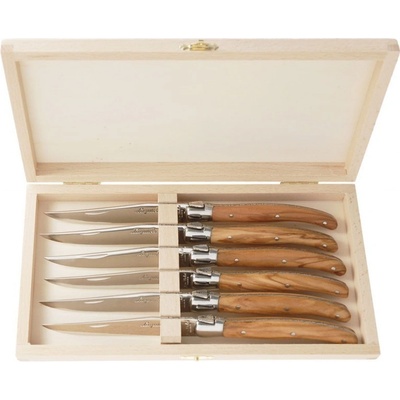 Steakové nože 6 dílná sada Laguiole Jean Dubost Materiál rukojeti je z olivového dřeva Čepel je z nerezová oceli 18/10 o tloušťce 2.5 mm Dodáváno v dřevěném boxu s...
