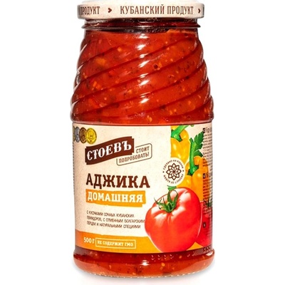 Adžika Domácí 500g Stoev Složení: rajčata 30%, rajčatový koncentrát, petržel, paprika, karotky, cibule, česnek, chili, cukr, jedlá sůl, kyselina: (kyselina octová), bobkový list, stabilizátor: modifikovaný škrob, konzervant: (sorbát draselný, benzoát sodný). Podmínky...