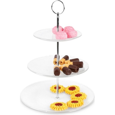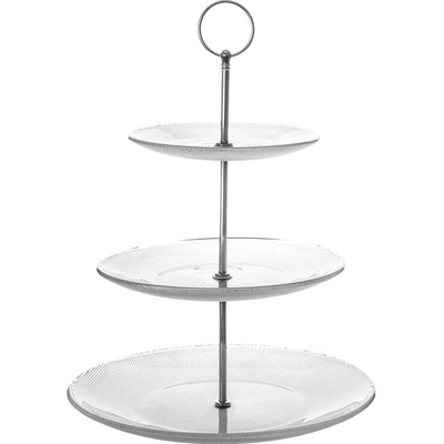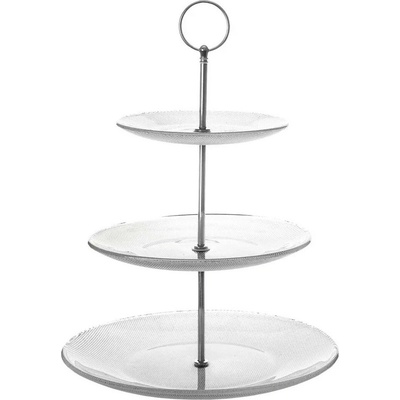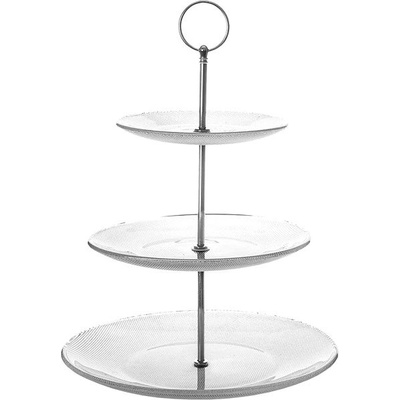 Elegantní třípatrový etažér o výšce 33 cm pro stylové servírování dezertů, ovoce a občerstvení. Vyroben z kvalitního skla s kovovým úchytem z nerezové oceli v barvě stříbra....