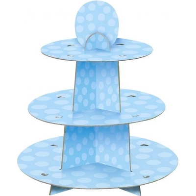 Papírový patrový stojan na mufiny a cupcake v růžové barvě. Velikost 31x23 cm Kartonový stojan na cupcaky, muffiny Skvělý doplněk k dekoraci stolu na miminko nebo k prvním narozeninám dítěte Modrá barva zdobená bílými puntíky Třípatrový stojan na dorty Výška: cca 34...