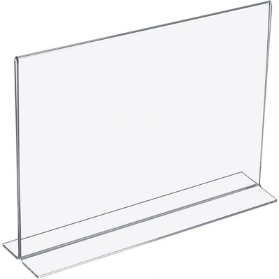 Čiré plastové ohýbané nabídkové plexi stojánky formátu A6 ve tvaru T na šířku. Využití: na letáky, prospekty, nabídkové restaurační menu, ceníky, aktuální cenové zvýhodnění,...