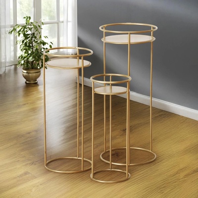 Vneste do svého domova styl, eleganci a praktičnost s touto sadou stojanů na květináče ve zlaté barvě. Sada obsahuje tři moderní stojany různých výšek, které společně vytvářejí...