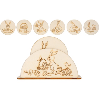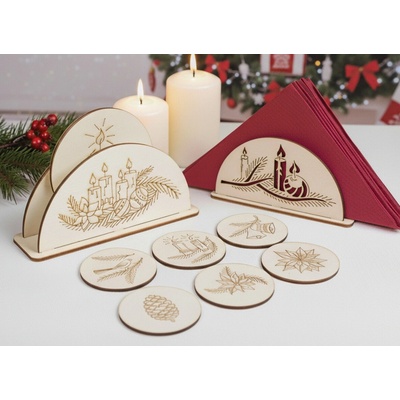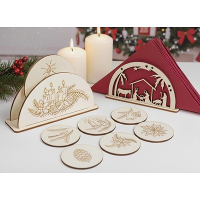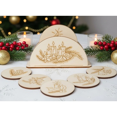 Vánoční dřevěný set podtácků se stojánkem – stylový doplněk pro váš domov Tento jedinečný set obsahuje dřevěný stojánek (107x143 mm) a 6 podtácků (⌀ 85 mm), které dodají...