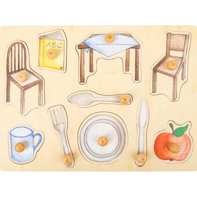 Dřevěná vkládačka pro malé děti s úchytkami a devíti vkládacími obrázky nejrůznějších věcí z domácnosti. Vkládačka děti učí všímavosti, rozvíjí představivost a paměť. Dřevěná...