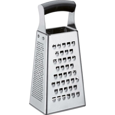 Klasické čtyřhranné struhadlo se všemi základními funkcemi a pevným držadlem. - materiál je nerezový - celková výška: 19,5cm - 5 různých struhadel - vyrobeno v ČR
