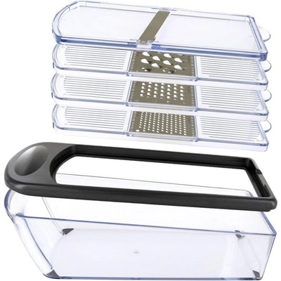ruční, určeno na zeleninu, všechny typy potravin, nerezové a plastové, s miskou a s nástavci, 4 nástavce součástí balení, 4 typy strouhání, části vhodné do myčky, transparentní...
