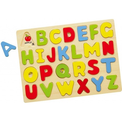 Dřevěná barevná vkládačka bez úchytek pro děti pro první seznamování s písmenky. Jednotlivé dílky (písmena) se umisťují do vyfrézovaných obrysů na dřevěnou desku. Pod písmenky se ukrývá obrázek s anglickým názvem. Rozměr složeného puzzle cca 30 x 23 cm