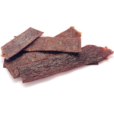 Novinka pro naše děti. Lahodné sušené zauzené pásky čisté svaloviny hovězího masa. Ještě měkčí pro lepší kousání a minimální obsah soli 1,5g / 100g splňují tedy pamlskovou...