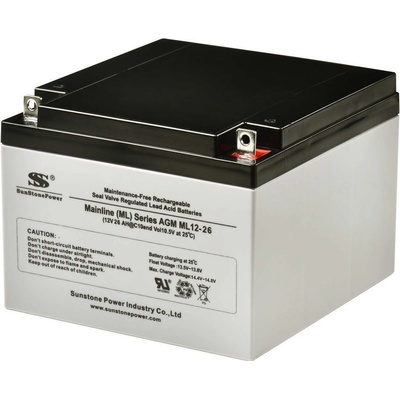 AGM akumulátor Sunstone Power ML12-26 je bezúdržbový AGM (elektrolyt vsáknutý do skelné tkaniny - obdoba gelu) VRLA (uzavřená konstrukce - plyny uvnitř rekombinují) akumulátor...