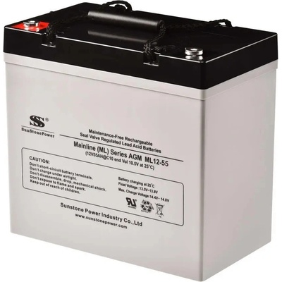 AGM akumulátor Sunstone Power ML12-55 je bezúdržbový AGM (elektrolyt vsáknutý do skelné tkaniny - obdoba gelu) VRLA (uzavřená konstrukce - plyny uvnitř rekombinují) akumulátor...