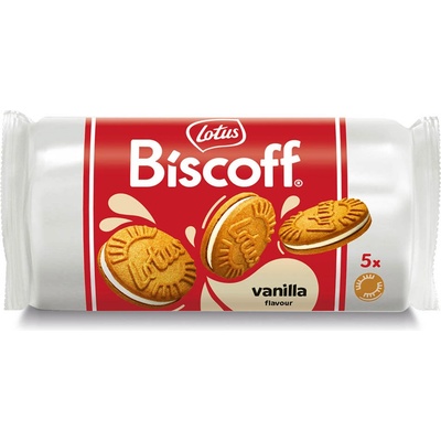Lotus Biscoff Karamelizované sušenky spojené náplní s vanilkovou příchutí 150g Unikátní chuť Lotus Biscoff nově přichází jako plněná sušenka!Delikátně křupavé sušenky plněné...