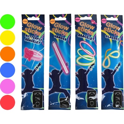 Druhy: motýlí náramek, náramek, brýle, tyčinka na zavěšeníBarvy: zelená, žlutá, červená, oranžová, modrá, růžováRozměr:Věk: 3+Materiál: plast