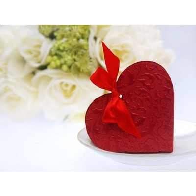 Svatební krabička vínově červené barvy ve tvaru srdíčka vyrobená z pevného papíru s vytlačeným vzorem. Ke krabičce je dodávána rudá saténová stuha k uvázání. Krabičku...