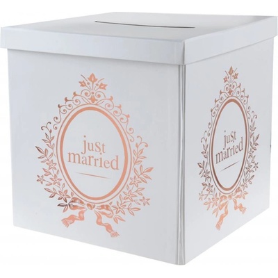 Krásná, elegantní krabice v bílé barvě s růžovozlatým nápisem Just Married na svatební blahopřání a peněžní dary od svatebčanů. Krabička je s víkem a otvorem pro