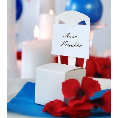 Bílá krabička ve tvaru židle na dárečky pro hosty a zároveň i jako stojánek na jmenovku. Jmenovka je součástí balení. Krabičku naplněnou svatebními mandlemi, čokoládovými...