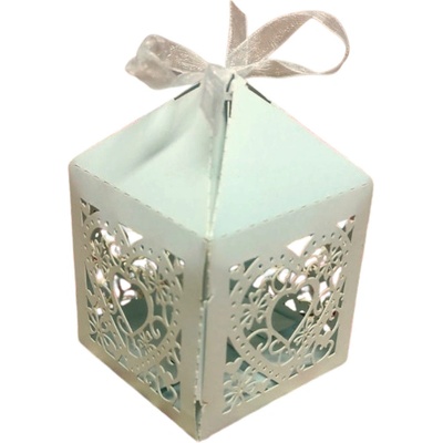 Svatební krabička s filigránovým designem – 5,5 × 5,5 × 8 cm Elegantní dárková krabička s jemným filigránovým vzorem, ideální na svatební výslužky, drobné dárky nebo sladké...