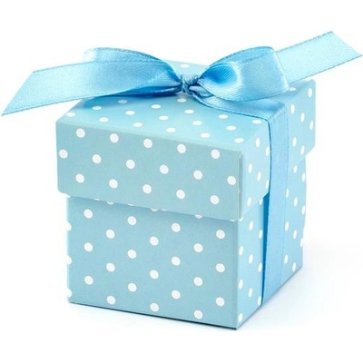 Krabička pro hosty s víčkem a stužkou ve světle modré barvě s bílými puntíky, krabička po složení má rozměry: 5,2*5,2 cm. Nápaditá a velice pěkná dekorace na svatební tabuli. Do...