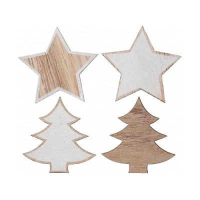 Vánoční dekorace strom a hvězda. Dekorace je v přírodní a bílé barvě. Rozměr: 4 x4 cm Balení: 12 ks
