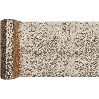 Stolová šerpa s flitry ve zlaté barvě. Šerpa středová je z polyesterové tkaniny, zdobená flitry z růžového zlata. Lze ji stříhat na požadovanou velikost bez roztřepe