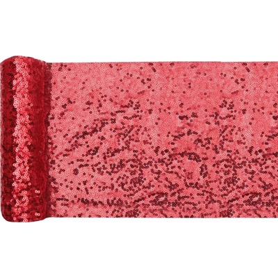 Stolová šerpa s flitry v červené barvě. Šerpa středová je z polyesterové tkaniny, zdobená flitry z růžového zlata. Lze ji stříhat na požadovanou velikost bez roztřep