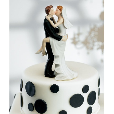 Romanticky veselá svatební figurka zobrazující svatební polibek ženicha držícího pevně v náruči nevěstu na vrcholu svatebního dortu. Figurky na dort jsou ručně malované,...