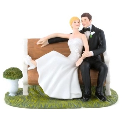 Romantická svatební figurka nevěsty a ženicha zachycených v obětí na lavičce v parku, nevěsta bondýnka má nohy zvedlé na lavičce, je oblečena v bílých šatech a na nohou má bílé střevíčky. Figurky na dort jsou ručně malované, precizně zpracované do nejmenších...